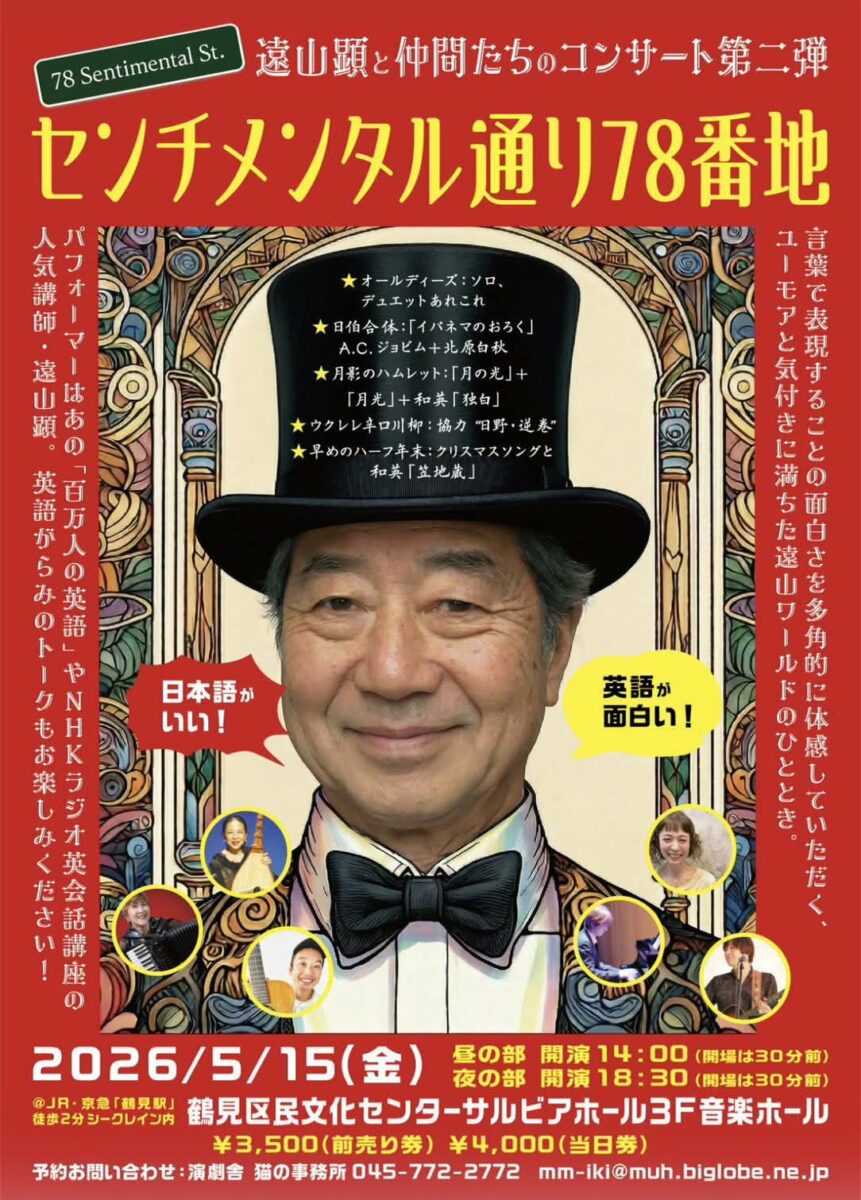 昨年に続き、NHK英会話講座でおなじみの遠山顕先生のコンサートに出演します。